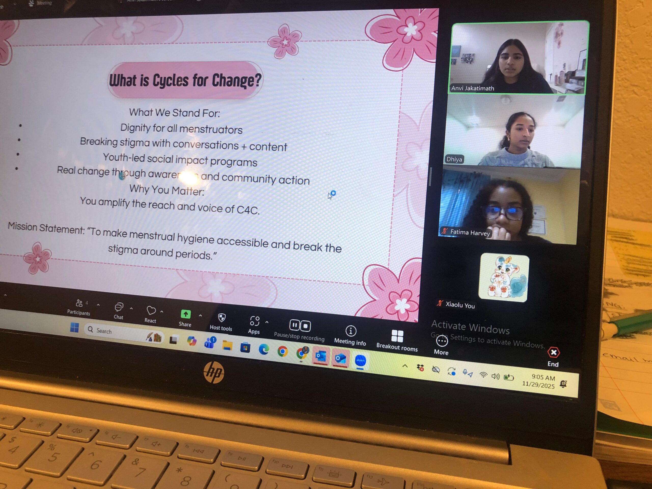 I wanted to fight back and do something to change this problem. Me and mMy friend and I worked together to hold a small pad drive and made countless visits to our administrator’s office in our school to install free menstrual dispensers. These small steps we took consistently eventually became Cycles for Change, the youth-led nonprofit I now co-run to fight period poverty and break the stigma around menstruation.